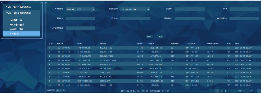 NAT实名审计:校园出口设备做了NAT转换,出现问题要溯源时无法找到真实的责任人,需要对大出口NAT等做转换日志找到真实地址,并和实名认证设备联动认证。